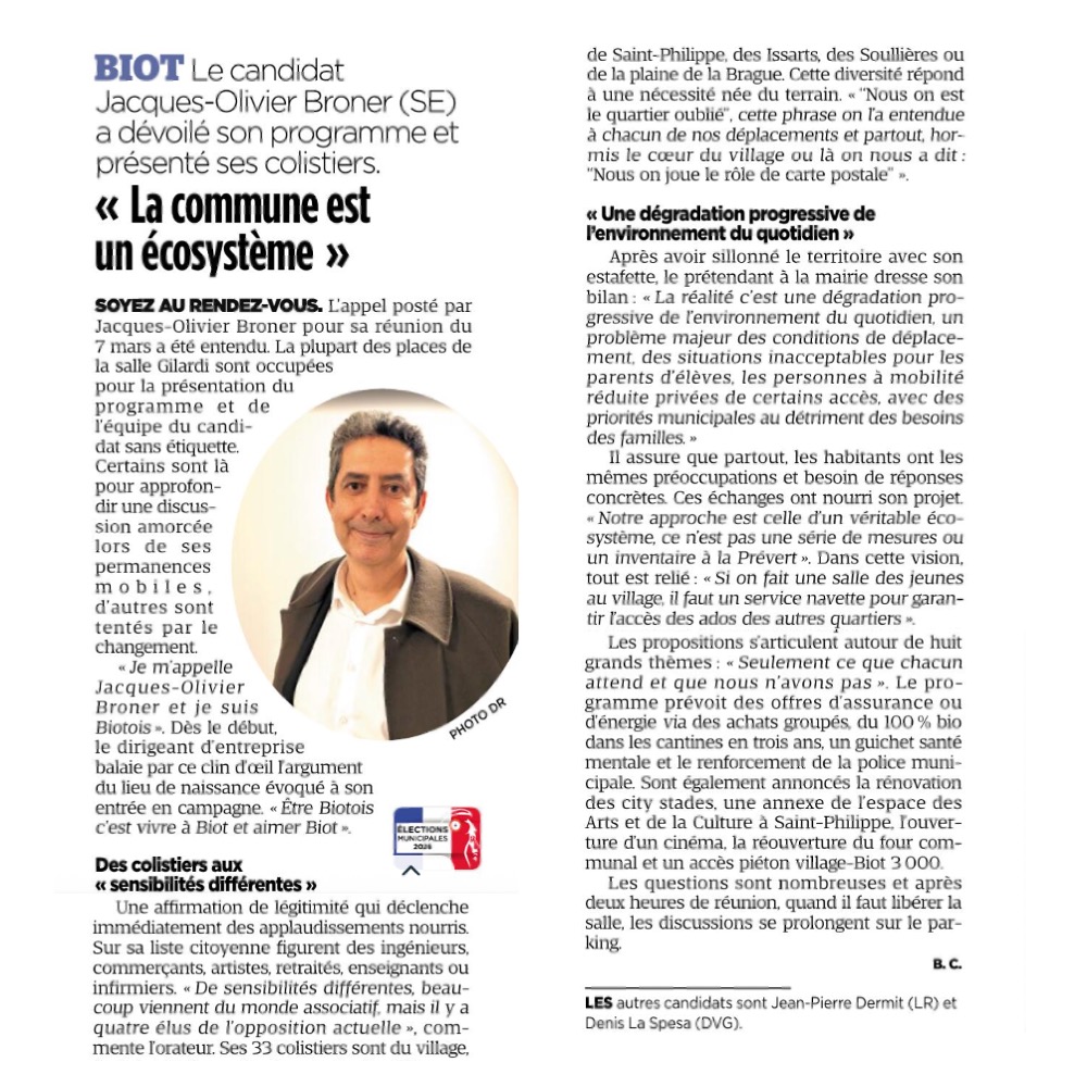 « La commune est un écosystème » : devant une salle comble, Jacques-Olivier Broner présente son programme aux municipales de Biot